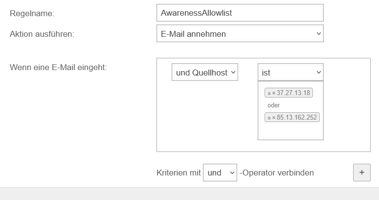 Wenn eine UTM im Einsatz ist, dann können die simulierten Phishing-Mails des Awareness Next Trainings nur dann durchgestellt werden, wenn im Mailfilter der UTM ein Allowlisting konfiguriert wird.