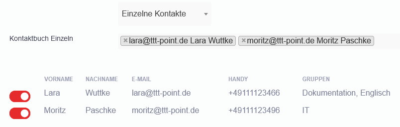 | Bei der Auswahl von Einzelne Kontakte | |||