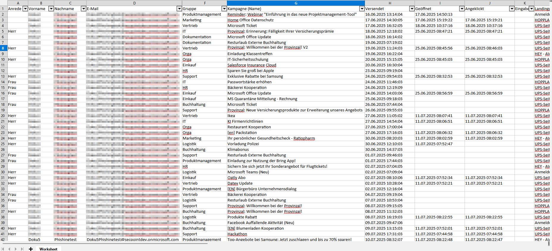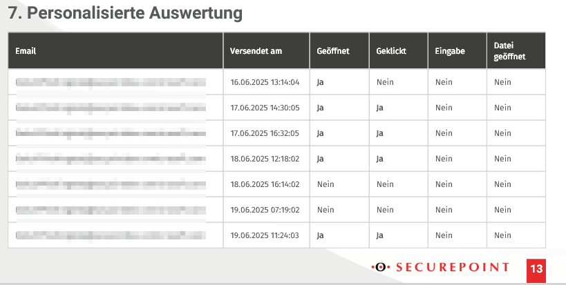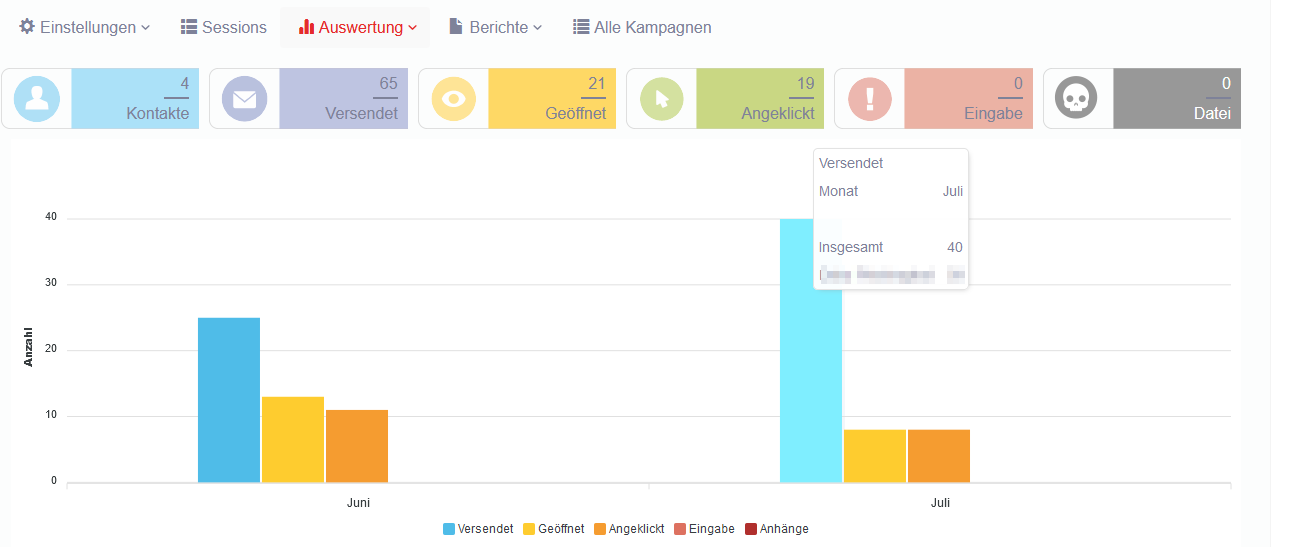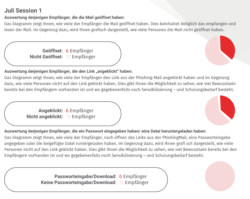 | Auswertung der Phishing-Kampagne unter diversen Gesichtspunkten. Detailinformationen finden sich in diesem Abschnitt