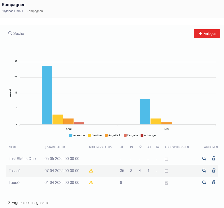 Reseller sehen nach dem Login ein Dashboard mit der Übersicht über die Phishing-Kampagnen ihrer Kunden.