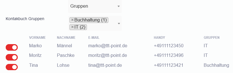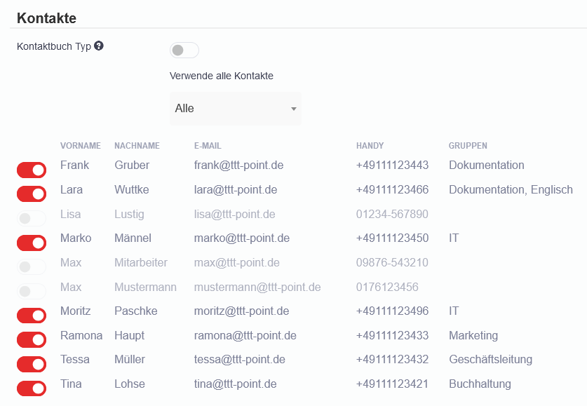 | Kontaktbuch Typ | Auswahl eines Mitarbeiters mit der Schaltfläche oder dessen Abwahl | ||