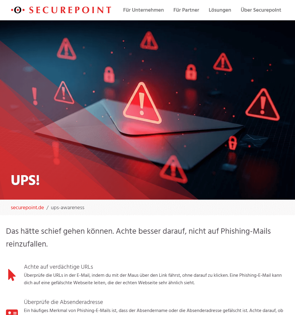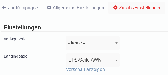 Das Standard-Set an Landingpages ist auf Deutsch und Englisch verfügbar. Man kann zudem eigene Landingpages erstellen über das Menu Landingpages wie z. B. die Sensibilisierungsseite UPS-Seite AWN | |