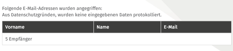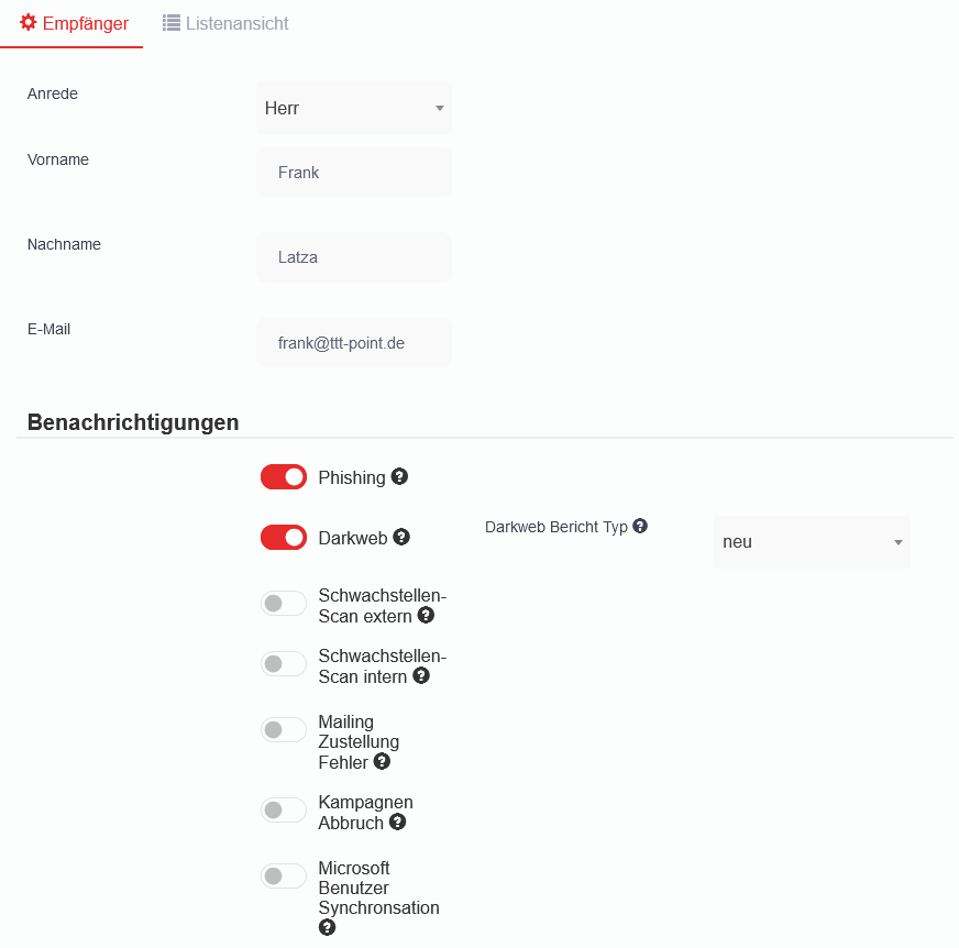 | Kontaktbuch Einzeln | IT Frank Gruber Lara Wuttke Ramona Haupt | Aus- oder Abwahl einzelner Mitarbeiter für den Darkweb-Scan | ![]() |