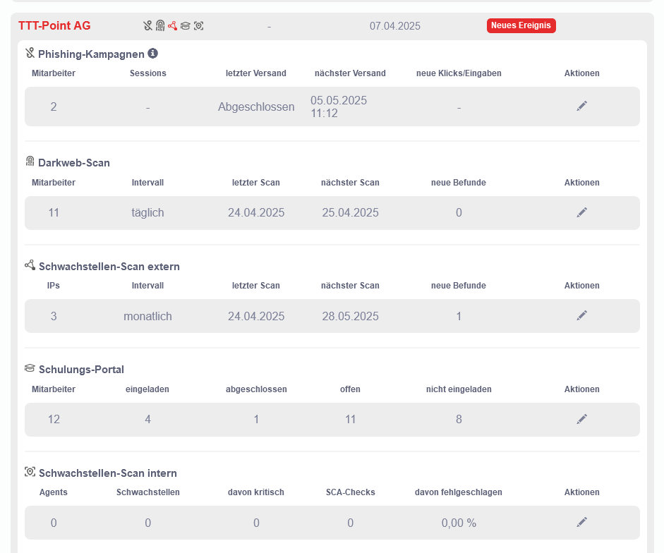 Kunden sehen nach dem Login ihr eigenes Dashboard mit den wichtigsten Kennzahlen zu ihren laufenden Phishing-Kampagnen.
