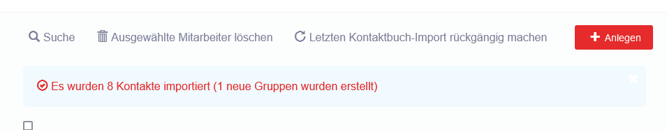 Der Kontakt-Import ist erfolgt. Die Mitarbeiter wurden der Gruppe Import zugewiesen. Optional: Die Gruppenzugehörigkeit der Mitarbeiter kann nachträglich geändert werden