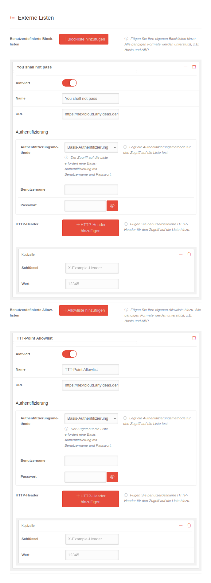 - Externe kommerzielle Listen können über einen HTTP-Header authentifiziert werden