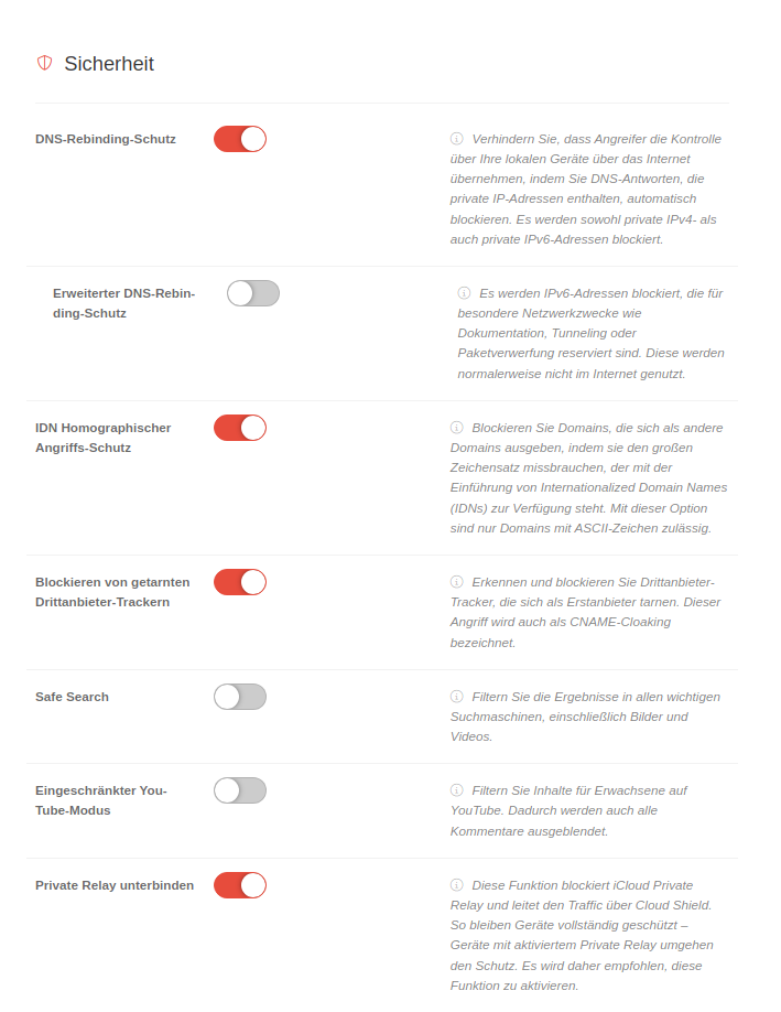 | DNS-Rebinding-Schutz | Durch die Aktivierung wird verhindert, dass Angreifer die Kontrolle über lokale Geräte über das Internet erlangen, indem DNS-Antworten, die private IP-Adressen enthalten, automatisch blockiert werden. Es werden sowohl private IPv4- als auch private IPv6-Adressen blockiert. | ![]() | |||||||||||