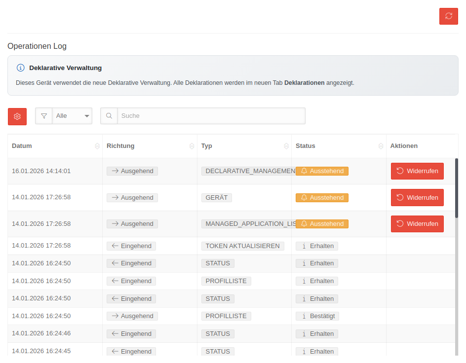 | notempty Dieser Reiter hat nur dann einen Inhalt, wenn das Gerät die deklarative Verwaltung auch unterstützt. Zeigt den aktuellen Status der deklarativen Verwaltung (Apple Declarative Device Management (DDM) ) des Gerätes an. Dieser ist eingeteilt in Konfigurationen und Verwaltete Konfigurationen. | |||||||||||||||||||||||||||