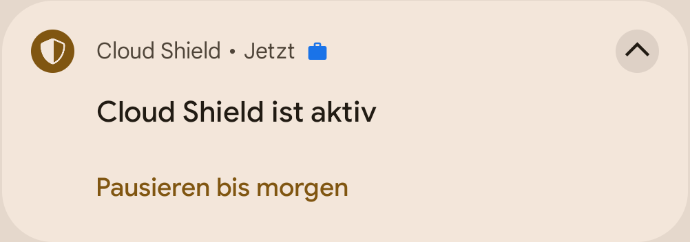 Dann kann die Cloud Shield-App über die Benachrichtigung mit pausieren bis morgen bis 05:00 Uhr am nächsten Tag pausiert werden.