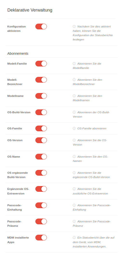 Ein Statusbericht über die auf dem Gerät, vom MDM, installierten Anwendungen. Dauerhaft aktiviert, um die deklarative Verwaltung vollständig zu unterstützen (ab iOS 17) Dauerhaft aktiv für alle Declarative Device Management (DDM)-fähigen Apple-Geräte |