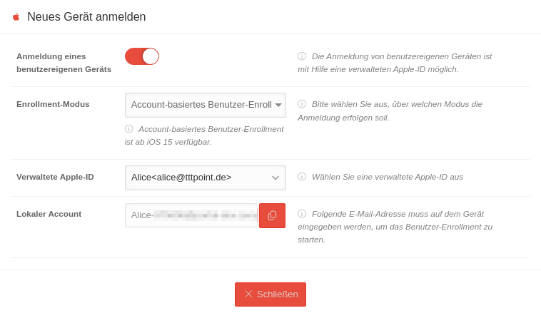 | Verwaltete Apple-ID | Alice<alice@tttpoint.de> | Auswahl der verwalteten Apple-ID | |