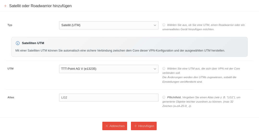 | Um einen Roadwarrior hinzuzufügen, wird bei einer aktiven, verbundenen Core-UTM auf die Schaltfläche Satellit / Roadwarrior geklickt. Es öffnet sich ein Dialogfenster, in dem der neue Roadwarrior konfiguriert wird. | |||
