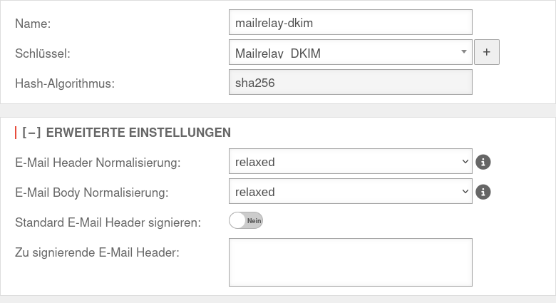 Standard E-Mail Header signieren: Ja Standardwert: h=From:Reply-To:Subject:Date:To:Cc:Resent-Date:Resent-From:Resent-To:Resent-Cc:In-Reply-To:References:List-Id:List-Help:List-Unsubscribe:List-Subscribe:List-Post:List-Owner:List-Archive;