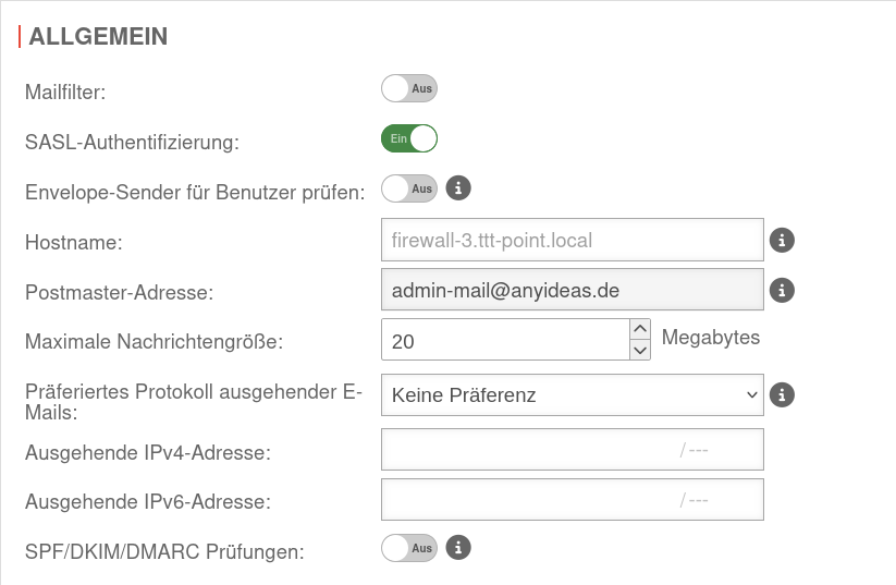 Unter Netzwerk Servereinstellungen Globale E-Mail Adresse: sollte unbedingt eine Postmaster-Adresse konfiguriert werden, sonst verbleiben nicht zustellbare Mails auf dem Festplattenspeicher. Dies kann dazu führen, dass der verfügbare Speicher irgendwann nicht mehr ausreicht und keine Mails mehr angenommen werden.
