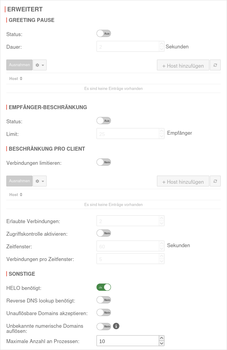 Maximale Anzahl an Prozessen: 10 Steuert die globale Anzahl gleichzeitiger Verbindungen zum Mailrelay (und anhängender Filter und Spamabwehr-Prozesse)