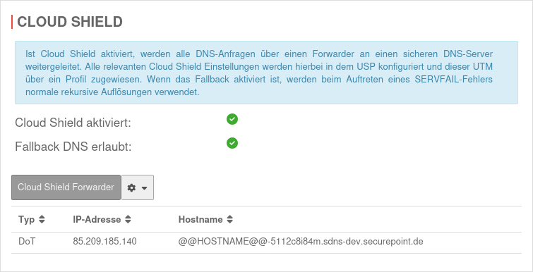 - Liegt eine Cloud Shield Konfiguration über die USC vor, kann lokal kein DNS-Forwarding konfiguriert werden