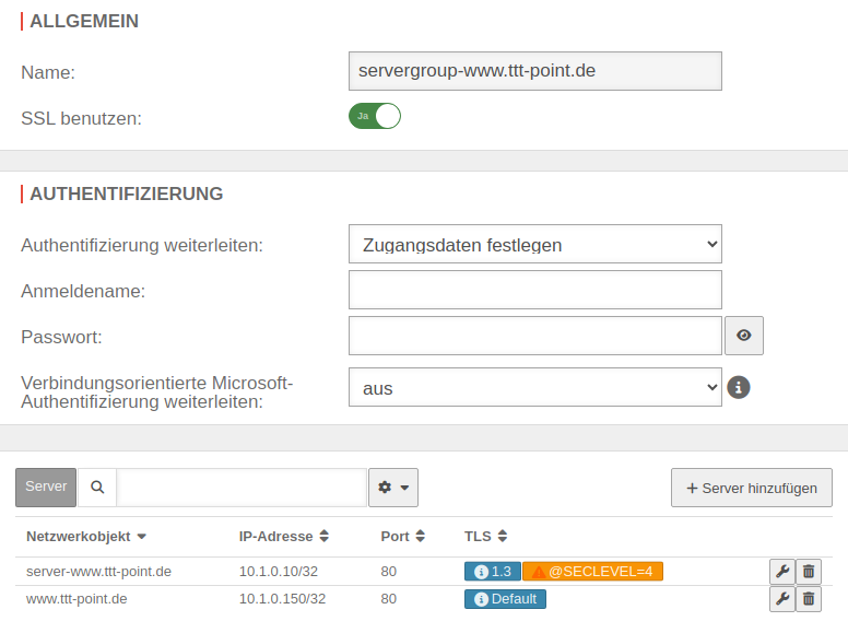 Externer Domainname: www.ttt-point.de Hier wird eingetragen, wie der Server hinter der UTM angesprochen wird.