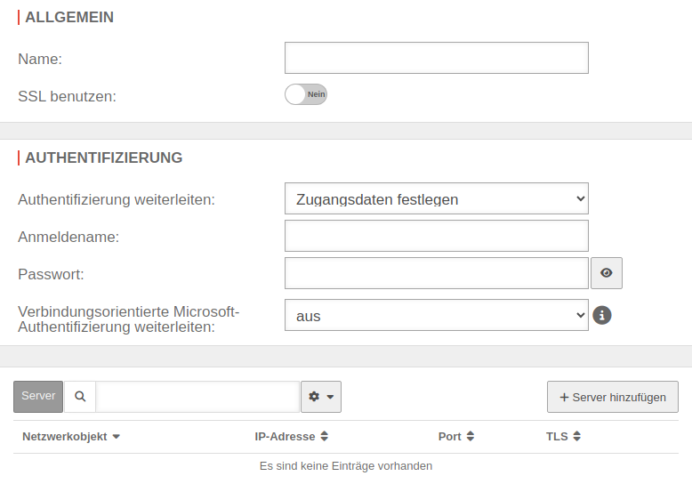 Authentifizierung weiterleiten: Zugangsdaten festlegen Leitet fixe Zugangsdaten (hier: Keine) an den Reverse Proxy weiter.