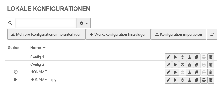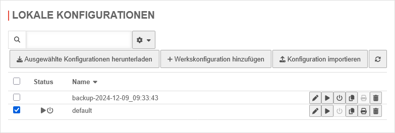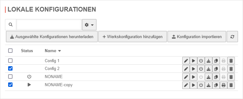 Ausgewählte Konfigurationen herunterladen Man wählt mithilfe der Checkboxen () ganz links aus, welche Konfiguration man herunterladen möchte. Anschließend klickt auf die Schaltfläche Ausgewählte Konfigurationen herunterladen. Es wird eine .zip-Datei mit der bzw. den Konfigurationen erstellt.