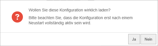 • Wird eine andere Konfiguration geladen, kann ausgewählt werden, ob die aktuelle Captive Portal Benutzerliste durch die Benutzerliste aus der zu ladenden Konfiguration ersetzt werden soll (Ja), oder ob die bestehende Benutzerliste unverändert bleibt (Nein).