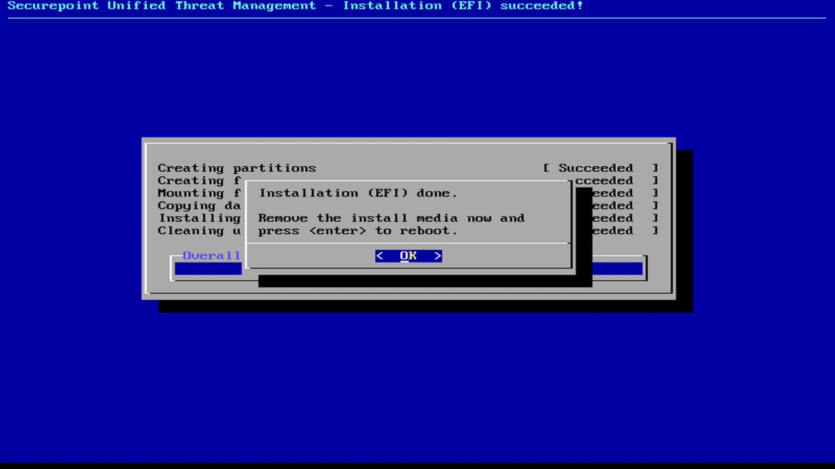 Ist die Installation erfolgreich verlaufen, wird der USB-Stick abgezogen und die UTM kann neu gestartet werden.