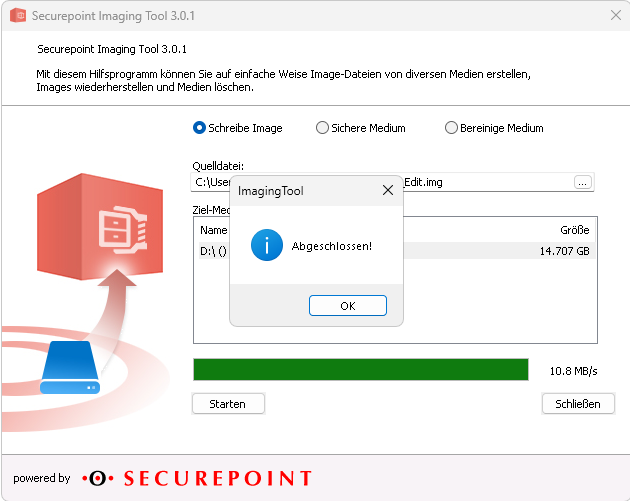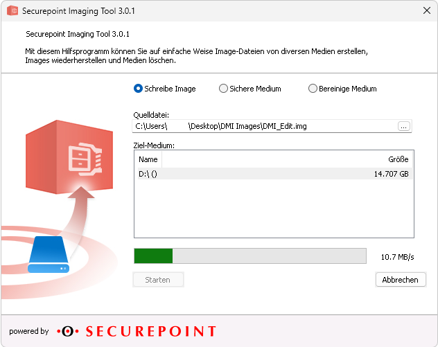 Zunächst wird das "DMI-Editor"-Image auf einen USB-Stick geschrieben. Dafür wird das Securepoint Imaging Tool gestartet.