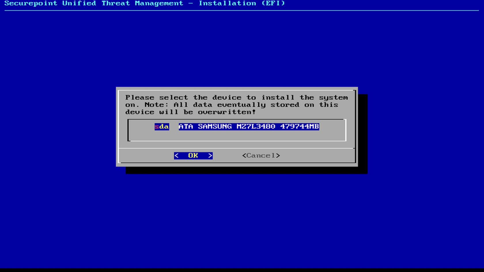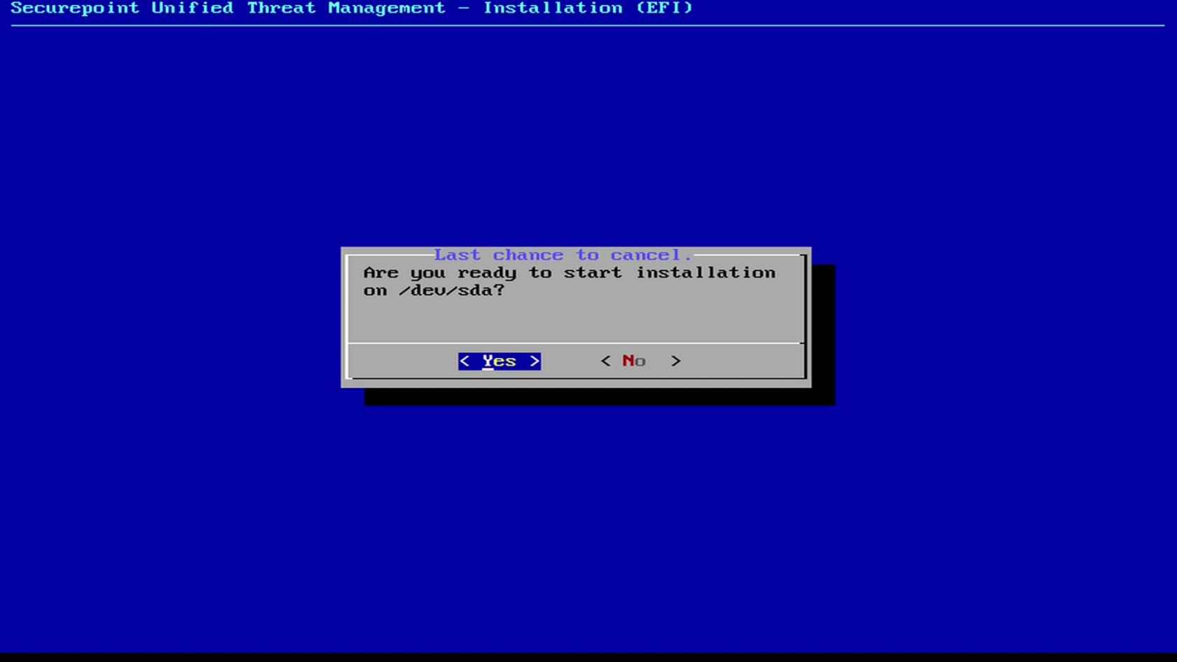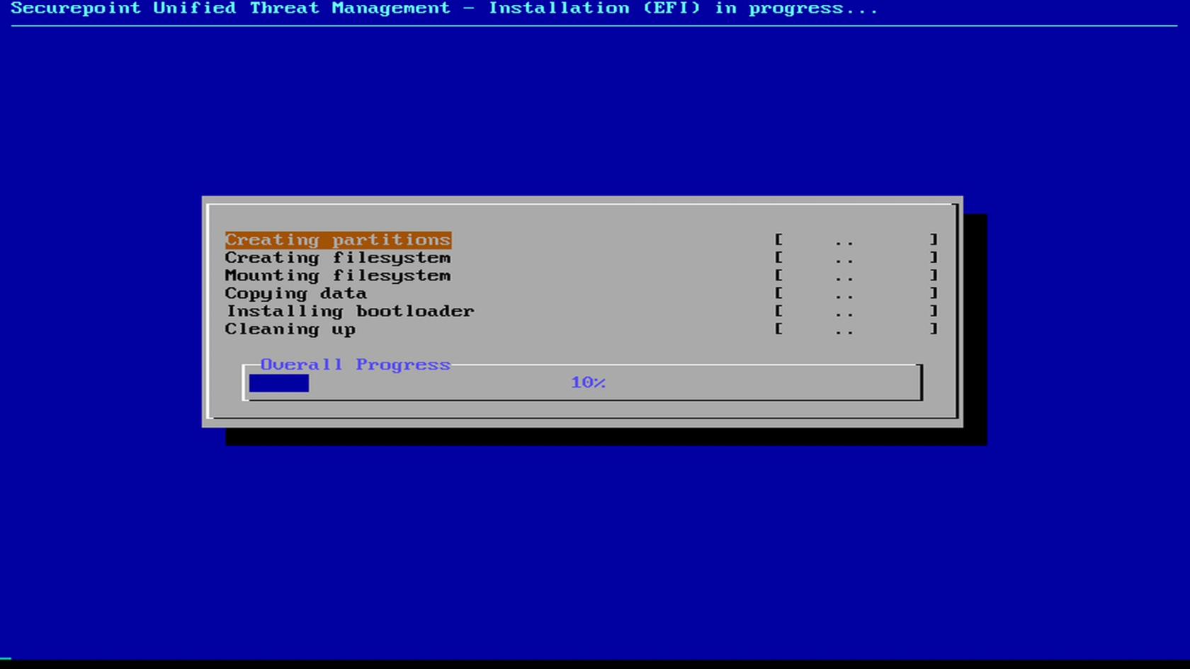Nun den USB-Stick mit dem Securepoint-Imaging Tool, wie oben beschrieben, mit dem Securepoint UTM-Image überschreiben. Den USB-Stick einstecken und die Installation wie gewohnt durchführen.
