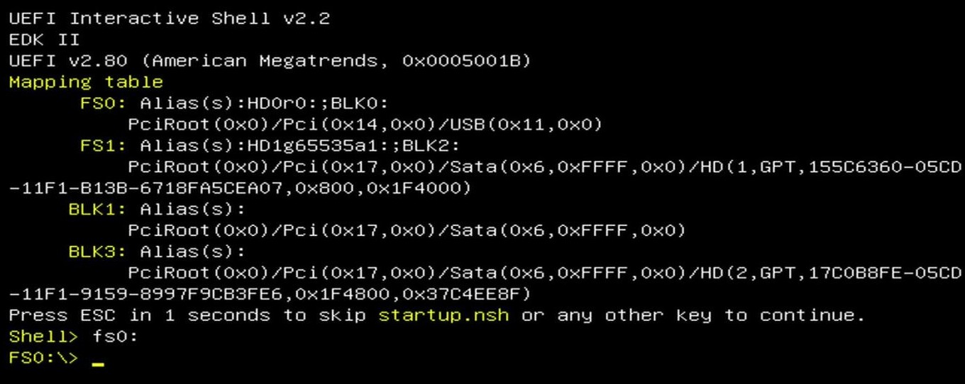 Das erkennt man durch /USB im Gerätepfad. In diesem Fall kann es also nur fs0 sein. Es ist darauf zu achten, dass hier die Amerikanische Tastatur gilt.