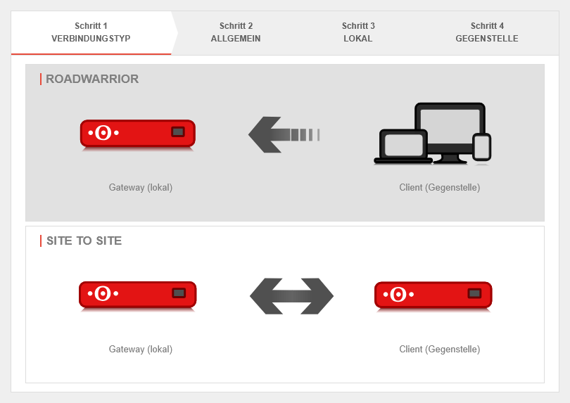 Auswahl des Verbindungs-Typs Roadwarrior Für die Konfiguration einer E2S / End-to-Site-Verbindung mit MSCHAPv2 wird Roadwarrior ausgewählt.