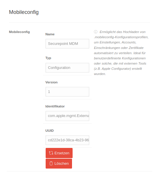 Profil-Konfiguration im Menüpunkt Mobileconfig