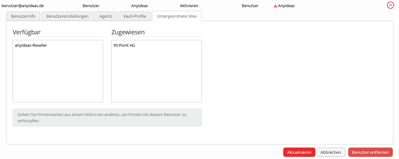 • Verfügbar Untergeordnete Sites (Sub-Sites), die durch den Reseller angelegt wurden und dem Benutzer zur Verfügung stehen können