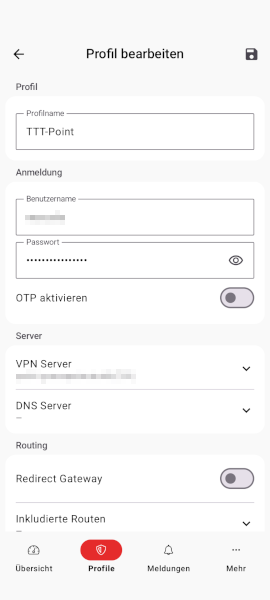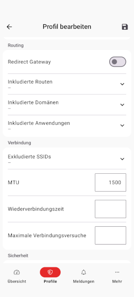 | notemptyLediglich manuell hinzugefügte VPN-Profile lassen sich vollständig überarbeiten. Beim Securepoint Mobile Security-Profil ist die Bearbeitung stark eingeschränkt. Ausschließlich veränderbar ist der Abschnitt Weiteres | |||