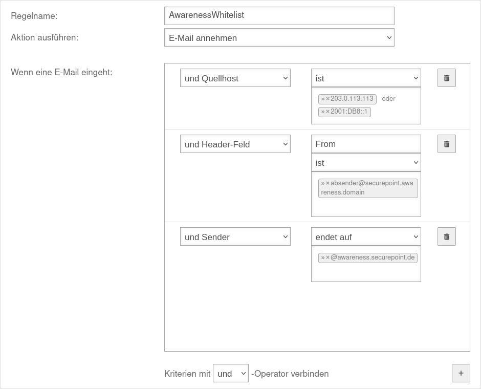 Damit die simulierten Phishing-Mails des Securepoint Awareness PLUS Trainings auch die Nutzerinnen und Nutzer erreichen können, muss im Mailfilter der UTM ein Whitelisting konfiguriert werden.