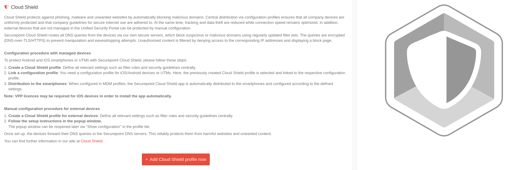 - notemptyA UTM license alone is not sufficient for Cloud Shield profiles of type External Devices (see below)! An MDM/UEP license is required for this!