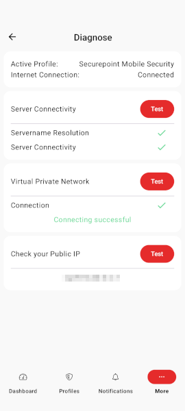 | Server reachability | The Test is used to test the reachability of the VPN Server in use. The VPN connection is briefly interrupted for this purpose. | ||
