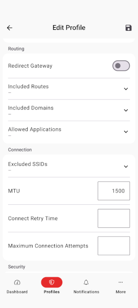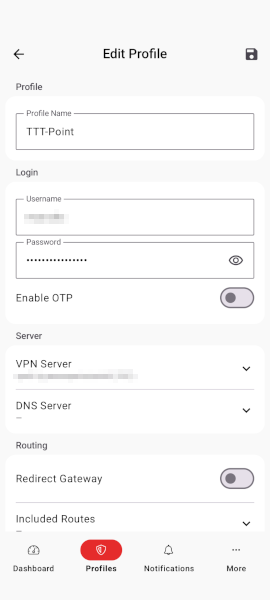 | Profiles created via the VPN configuration in the portal have very limited editing options in the VPN app. Therefore, these profiles must be edited directly in the portal. | |||
