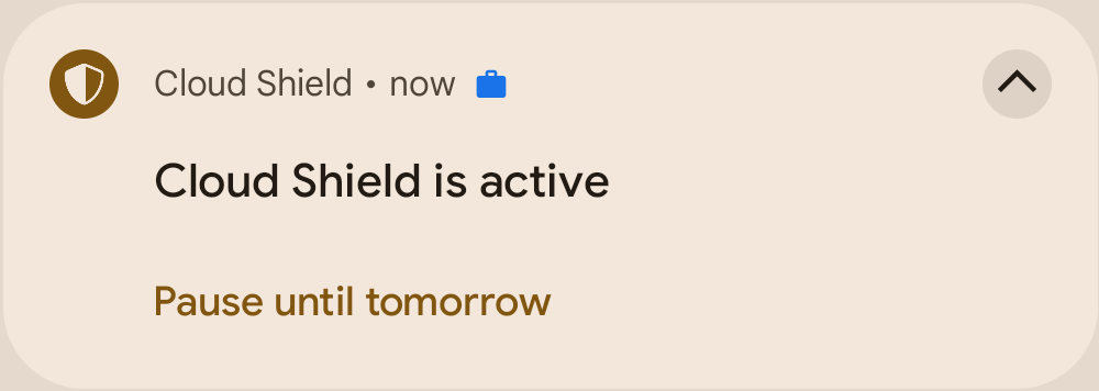 Dann kann die Cloud Shield-App über die Benachrichtigung mit pausieren bis morgen bis 05:00 Uhr am nächsten Tag pausiert werden.