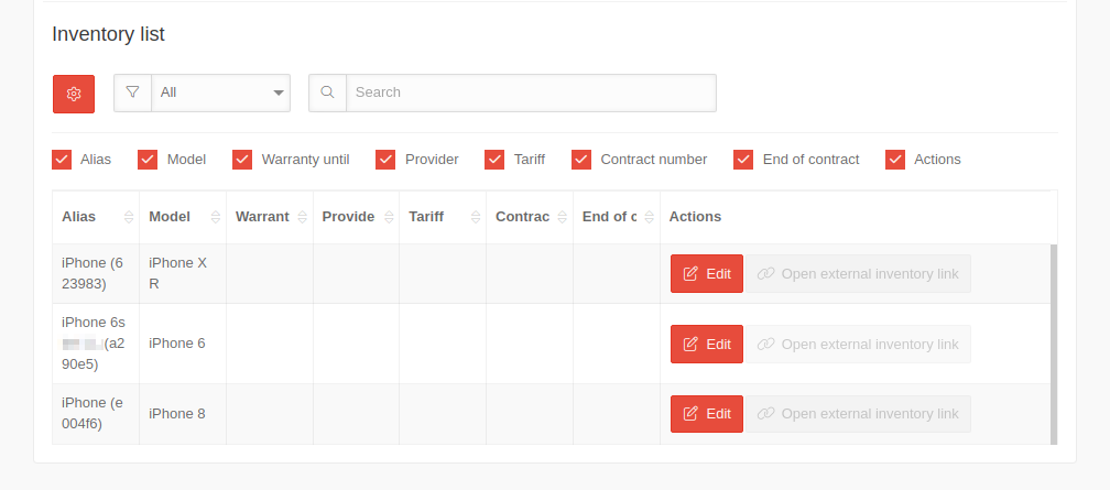 Alias Modell Warranty until Provider Tariff Contract number End of contract Action