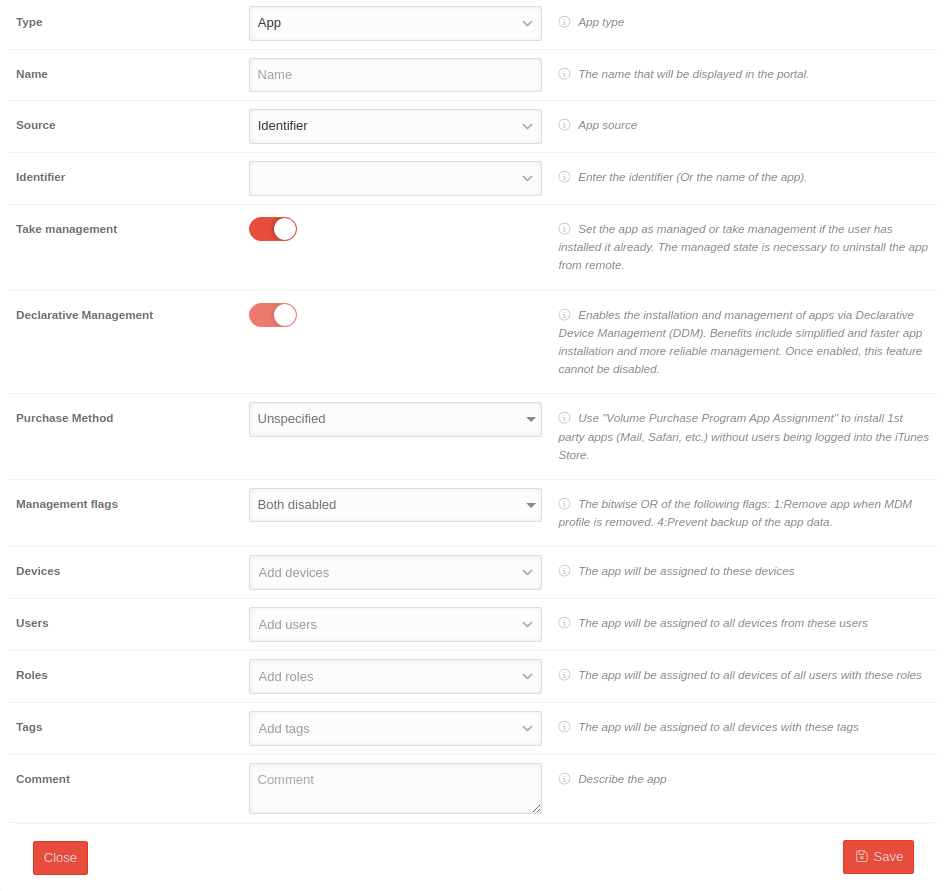 | roles | Add roles | The app is assigned to all devices by all users with these roles | |