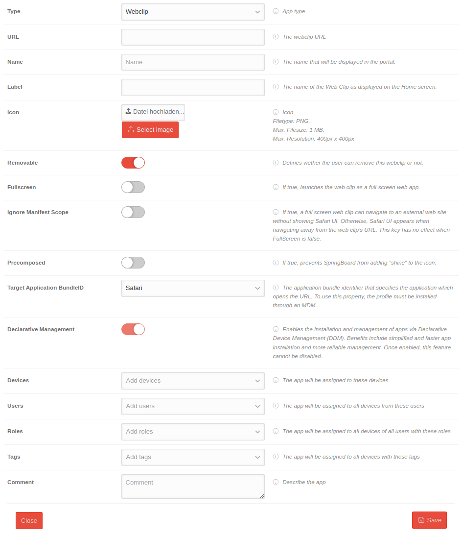 The app can be linked to devices, roles, users and tags. You can also upload your own icon (JPEG or PNG). With the selection of the platform also different sources are available.
