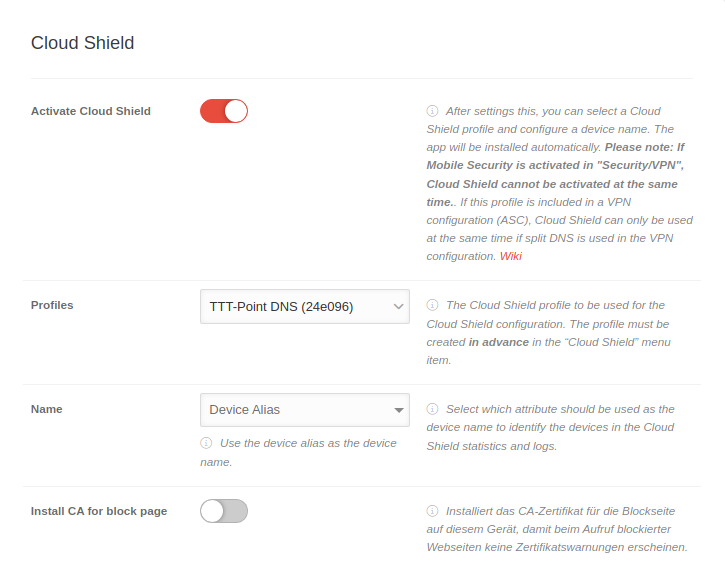 Profile configuration in the Cloud Shield
