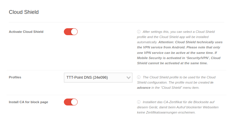 | Activate Cloud Shield | After enabling a Cloud Shield Profile can be selected, and the Cloud Shield App for Android will be installed automatically. In the