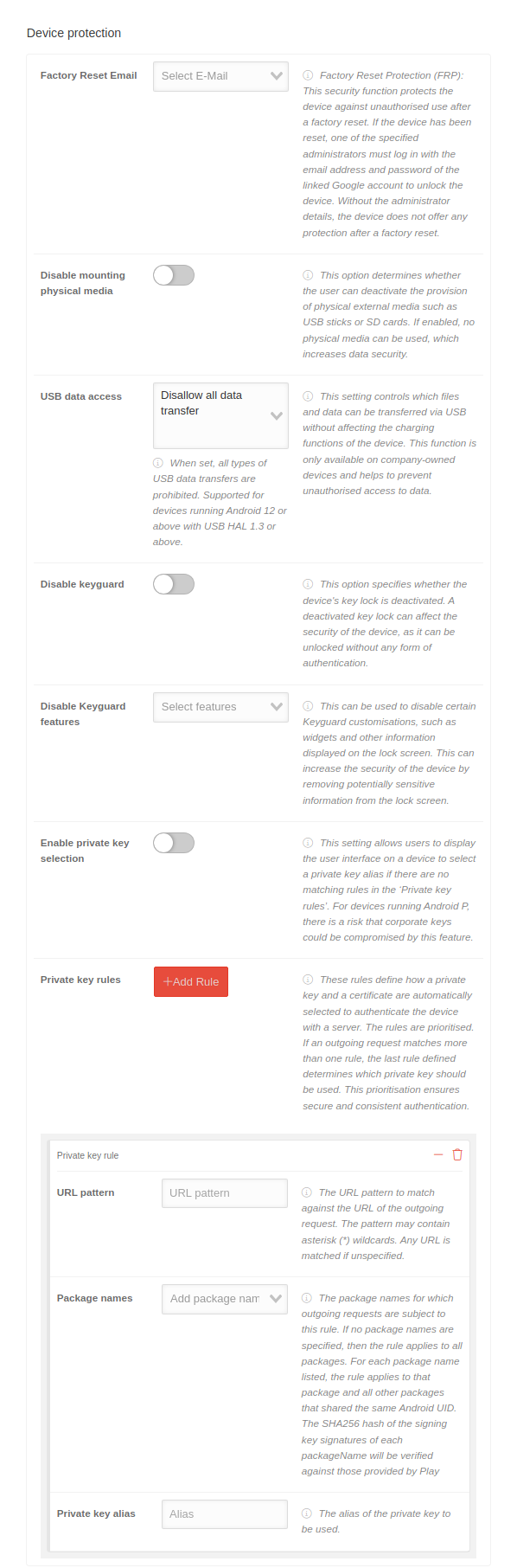 Allows the user interface to be displayed on a device so that a user can select a private key alias if there are no matching rules in ChoosePrivateKeyRules. For Android P devices, this setting can attack company keys.
