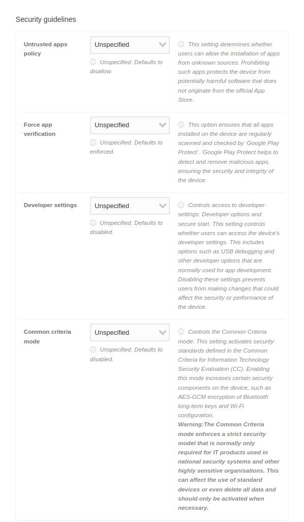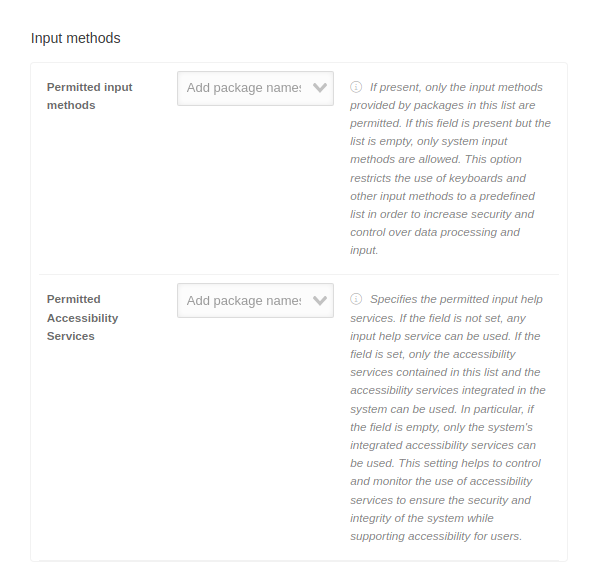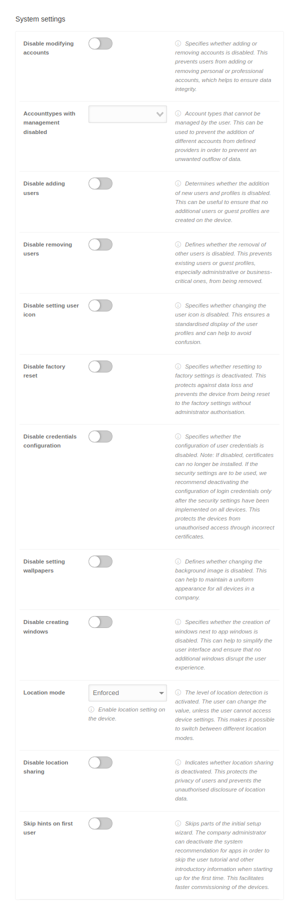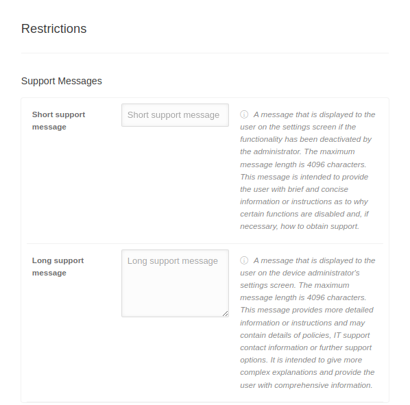 A message that is displayed to the user on the settings screen when the functionality has been disabled by the administrator. The maximum message length is 4096 characters.