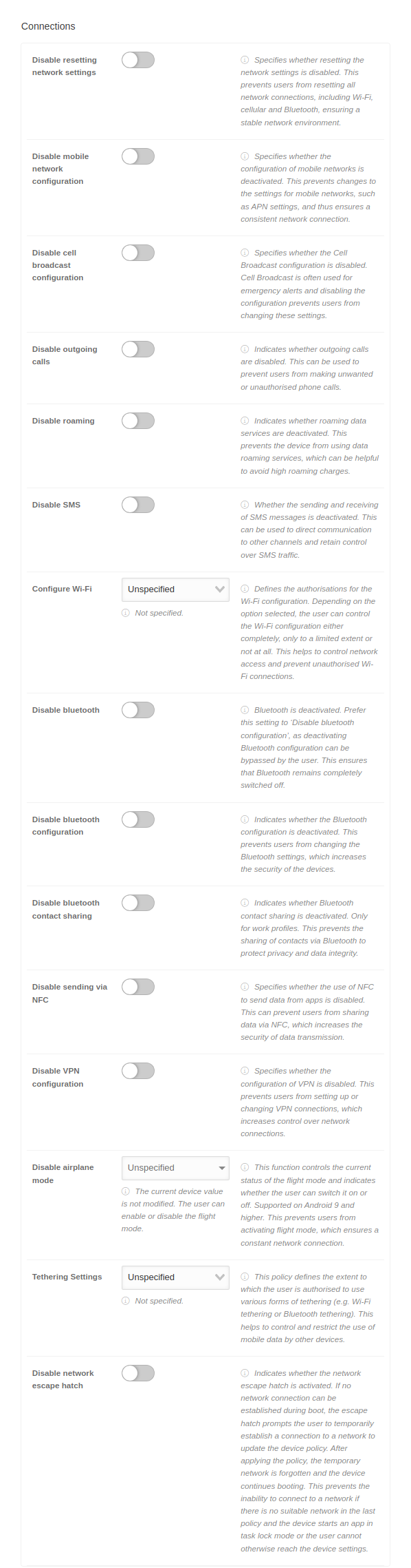 This policy defines the extent to which the user may use various forms of tethering (e.g. Wi-Fi tethering or Bluetooth tethering).