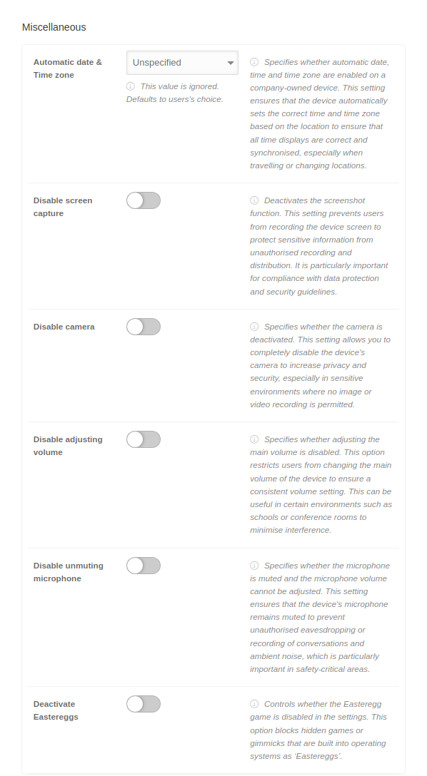 This setting allows you to completely disable the device's camera to increase privacy and security, especially in sensitive environments where no image or video recording is permitted.