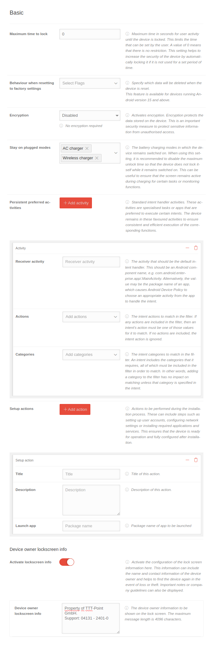 Android profile configuration in the Basic settings menu item