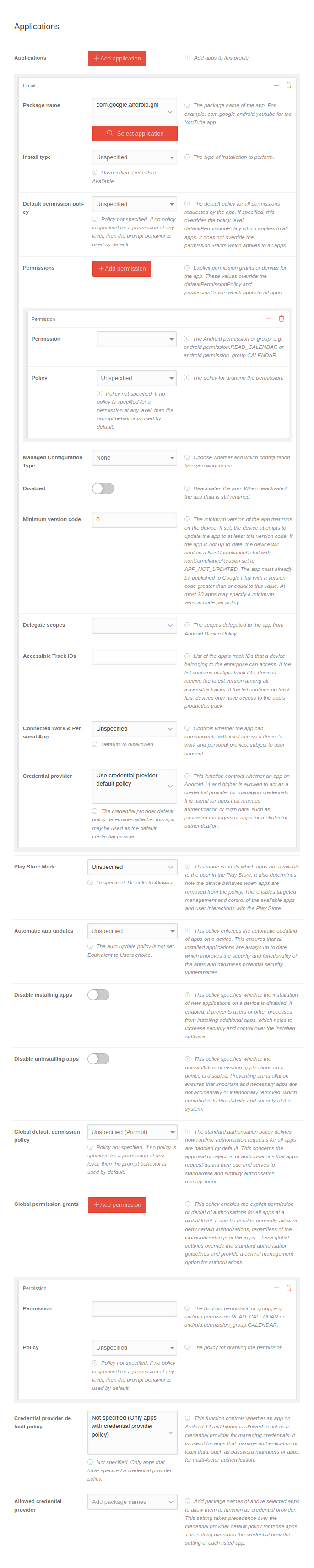 | Personal applications | Add applications | Guidelines for apps in the personal profile of a company-owned device with a work profile. Each click on the button adds a section Application by customizing an app. | |||||||