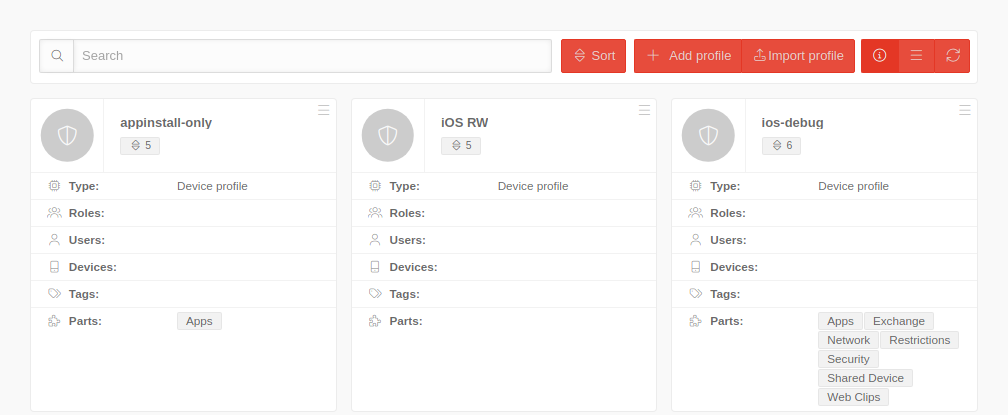 | In the profile overview new profiles can be created, existing ones can be edited and deleted. The view of the profiles can be displayed in the list or tile view. You can also view details of existing profiles, update the list of profiles, and publish profiles. | ![]() |
