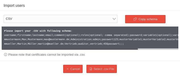 | Download CSV | Exports the user data to a file: users.csv The file contains the fields (comma separated): "username","firstname","lastname","email","comment","roles" | |